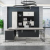 Bàn giám đốc hiện đại Phita được thiết kế theo phong cánh hiện đại lấy cảm hứng từ sự đơn giản, cách tân trong thiết kế mới. Bàn kết hợp giữa phần chân sắt nhập khẩu được thiết kế tinh tế với phần gỗ công nghiệp MFC hiện đại thừa hưởng đầy đủ tính ưu việt của gỗ công nghiệp. Phần tủ phụ được thiết kế với đầy đủ công năng gồm 3 ngăn kéo, cánh tủ mở và 1 khoang để CPU máy tính. Phần mặt bàn được thiết kế nắp đi dây điện bằng hợp kim nhôm tạo sự sang trọng.