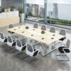 Bàn họp văn phòng chân sắt BH11 được làm bằng mặt gỗ công nghiệp MFC. Mặt bàn dày 25mm. Chân sắt sơn tĩnh điện chống gỉ theo thời gian. Bàn có kiểu dáng đơn giản, mặt bàn hình chữ nhật , với chiều cao tiêu chuẩn. Thường được để trong phòng họp, phù hợp với nhiều loại ghế khác nhau, giúp tô điểm cho không gian văn phòng.