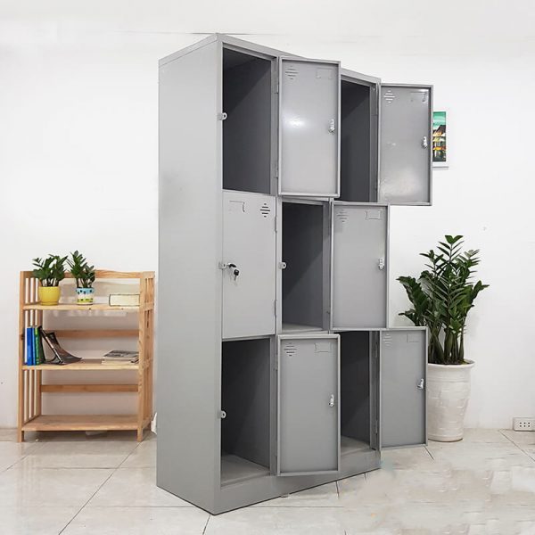 Văn phòng của bạn sẽ không thể thiếu những mẫu tủ locker 9 ngăn đẹp được sử dụng để đựng đồ cá nhân, hồ sơ, tài liệu, tại các văn phòng, cơ quan, nhà hàng, xí nghiệp,…Chiếc tủ được làm bằng thép cao cấp phun sơn tĩnh điện chống trầy xước. Tủ có thiết kế 9 ngăn và có tay nắm kéo, ổ khóa cùng các ngăn để tài liệu riêng biệt.