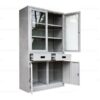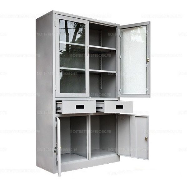 Tủ sắt văn phòng cánh kính ngăn kéo được sử dụng để đựng đồ cá nhân, hồ sơ, tài liệu, tại các văn phòng, cơ quan, nhà hàng, xí nghiệp,…Chiếc tủ được làm bằng thép cao cấp phun sơn tĩnh điện chống trầy xước. Tủ có khoang ngăn kính bên trên, có 2 đợt chia làm khoang làm 3 ngăn tiện lợi, 2 ngăn kéo ở giữa, khoang cánh kính bên dưới